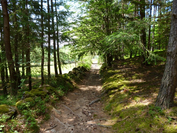 Kurz nach Montarcher, in Egarande, teilt sich der Jakobsweg. Links führt die alte Streckenführung entlang des Wanderweges GR3 über Retournac und die Schluchten der Loire nach Le Puy-en-Velay, während rechts der etwas neuere Weg über Usson-en-Forez und Saint-Paulien die Strecke um etwa 20 Kilometer abkürzt. Ich habe mich für die neuere Strecke entschieden, nicht nur, um schneller ans Ziel zu kommen, sondern auch, weil ich über die Voie Bolléne und Chemin de César laufen wollte. Voie Bolléne ist ein Weg der Kelten und Römer, so genannt, weil die Entfernungen mit militärischen „Meilensteinen“ markiert waren, den bornes militaires. Chemin de César, Cäsars Weg, geht auf die römische schnelle Verbindungsstraße zwischen Lyon, Aquitanien und Spanien zurück.[3]