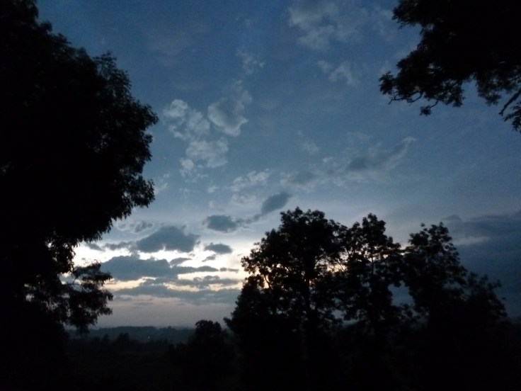 Das Haus von Herrn und Frau Vrai liegt in Chaturanges, einem Dorf ein wenig außerhalb des Weges, und deshalb nahm mich Herr Vrai mit seinem Auto mit. Chaturanges liegt am Fuße eines erloschenen Vulkans, eines kleinen Puys. Die Wolken zogen sich zusammen und ein Unwetter bahnte sich an. Ich konnte am Abend noch einige Bilder vom Sonnenuntergang fotografisch festhalten. Herr und Frau Vrai aßen mit mir gemeinsam zu Abend, während draußen der Wind die Regentropfen gegen die Fensterscheiben peitschte.