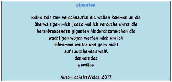 Seit einigen Wochen habe ich mit einer Textform experimentiert, die ich irgendwo zwischen Lyrik und Prosa ansiedeln würde. In den Texten verschwimmen die Grenzen zwischen den Sätzen und Satzteilen und ergeben so beim Lesen beinahe einen neuen Sinn.schrittWeise, ohnepunktundkomma