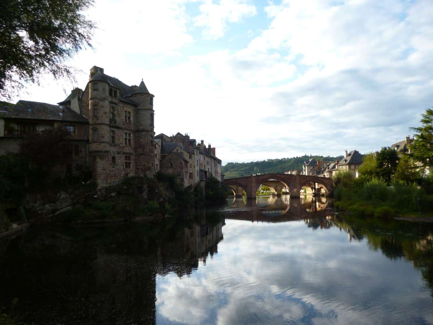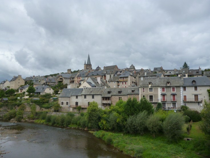 Nachdem wir die sehr schöne Perserkirche verlassen haben, kamen wir nach ungefähr 20 Minuten in das Zentrum von Espalion an. Sofort fielen uns die markante Pilgerbrücke „Vieux Pont“ („Alte Brücke“) und das Renaissancepalais von 1572 am Lotufer auf. Paul beschloss doch weiterzugehen, weil wir noch keine andere Herberge für ihn finden konnten. Die beiden Uferseiten säumen alte Gerberhäuser, die an die handwerklich geprägte Vergangenheit der Stadt erinnern. Noch sind unter den Balkonen steinerne Trittstufen erkennbar, auf welchen die Gerber früher ihrer Arbeit nachgingen.[6]