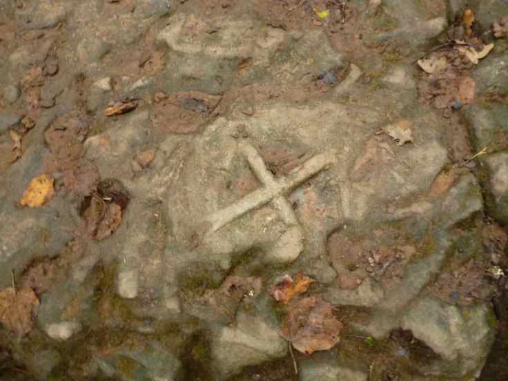 Auf dem Weg durch ein Wäldchen kurz nach Saint-Côme bemerkte ich ein kleines Kreuz auf einem Stein. Daneben wurde eine Erklärtafel angebracht, die auf das Steinkreuz eingeht, ohne eine konkrete Antwort zu geben.