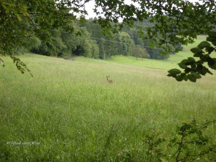 Auf dem Weg durch die grenzüberschreitende und wenig bewohnte Region bemerkte ich auf einer Wiese ein Reh, das scheu zu mir sah und wenige Sekunden später davonlief. Ich hatte aber noch Zeit, ein Foto zu machen.