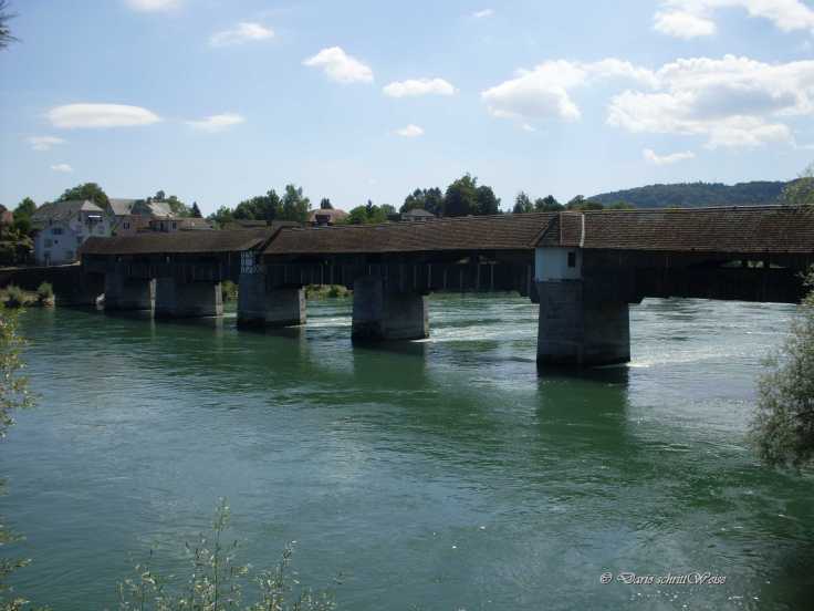 Am späten Nachmittag kam ich an einem weiteren Kraftwerk, dem Rheinkraftwerk Säckingen vorbei und über die Schweizer Stadt Stein in Bad Säckingen an. Die Stadt Stein sollte nicht mit „Stein am Rhein“ verwechselt werden, dem Ort bei Schaffhausen. In Stein lief ich über eine besondere gedeckte Holzbrücke, die Bad Säckingen mit der auf der gegenüberliegenden Uferseite verbindet.