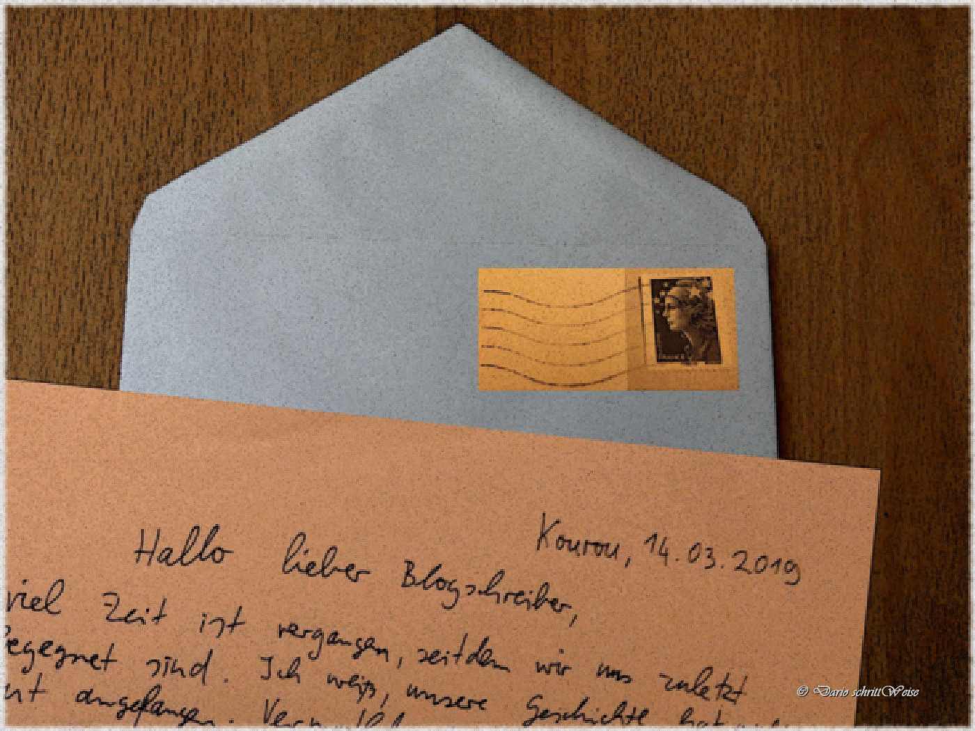 viel Zeit ist vergangen, seitdem wir uns zuletzt begegnet sind. Ich weiß, unsere Geschichte hat nicht gut angefangen. Vermutlich hast du mein erstes Erscheinen als unerhört empfunden. Wer möchte schon ungebeten vertreten werden? Wer mag eine Kopie, einen billigen Abklatsch des Originals? Auch die zweite Begegnung ist wohl nicht nach deinem Plan verlaufen. Ich bin dir gefolgt, du hast nicht so glücklich gewirkt, als du mich entdeckt hast. Ich kann es verstehen, mir würde es ähnlich gehen. Jetzt soll aber alles anders werden. Ich wollte mich bei dir melden und dir mit diesem Brief per Luftpost die Hand reichen. Hoffentlich kannst du mir meine etwas unkonventionelle Art verzeihen.