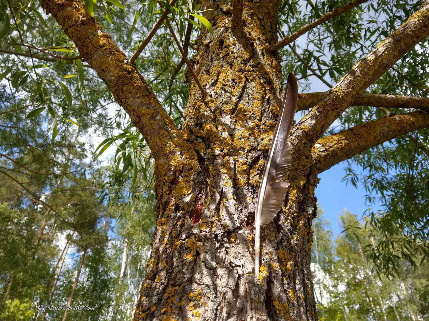 Beinahe schwerelos schwebt die kleine Feder durch die Luft, tanzt ausgelassen, vollführt Pirouetten und kleine Luftsprünge. Ich verfolge ihren Flug mit meinem Blick, staune als sie mit der Spitze in einem kleinen Spalt in der Rinde eines Baumes zur Ruhe kommt. Im Baum findet die Feder ihr neues Zuhause. Ihr „Federkleid“ in die Höhe gereckt, scheint sie nach oben zu streben. Gleichzeitig deutet ihre Spitze nach unten, zu den Baumwurzeln. Sie bleibt gedanklich verwurzelt, bodenständig.