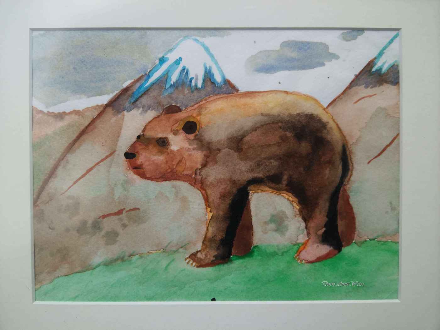 Das Aquarellbild malte ich vor vielen Jahren. Als Vorlage für die Malerei diente mir eine kleine, geschnitzte Bärenstatue aus Holz. Ich finde es interessant, dass ich schon damals gerne Berglandschaften als Motiv gemocht hatte. Etwas scheint mich daran anzuziehen.