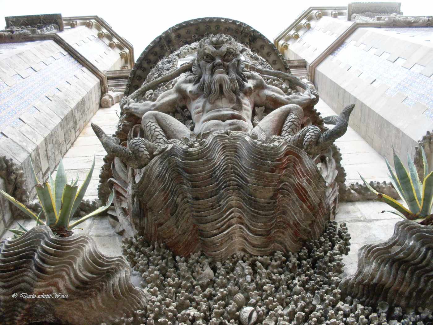 Grimmig bewacht das eigenwillige Wesen den Eingang zum prachtvoll gestalteten Schloss. Halb Mensch, halb Meeresbewohner steht es an der Grenze zwischen den beiden Welten. Stolz wie ein Meeresgott scheint die Kreatur einer Muschel im Meeresschaum zu entsteigen, um die Besucher am Passieren zu hindern. Der ungewöhnliche Wächter aus der Unterwasserwelt lehnt an einem Turm, die Neuankömmlinge fest im Blick behaltend.
