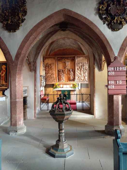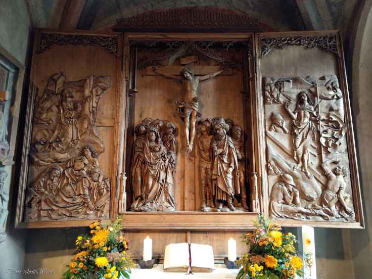 Ein weniger bekanntes Werk von Riemenschneider ist das Kreuzigungs-Retabel von Detwang, das ich im Herbst 2020 besichtigen konnte, als ich einige Tage im Taubertal verbracht hatte. Das Kunstwerk befindet sich in der evangelisch-lutherischen Pfarrkirche St. Peter und Paul. Das ehemalige Reichsdorf Detwang, ungefähr 2 Kilometer von Rothenburg ob der Tauber entfernt, wurde erstmals im Jahr 930 urkundlich erwähnt.