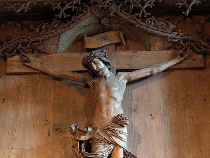 Im Mittelteil des Riemenschneiderretabels sehen wir das klassische Motiv von Jesus auf dem Kreuz. Jesus‘ Augen sind geschlossen, seinen Kopf mit der Dornenkrone hat er gesenkt. Vermutlich zeigt ihm die Holzskulptur im Moment seines Todes, worauf auch die Wunde links unterhalb der Rippen hindeutet. Über ihm ist die bekannte Innschrift „INRI“ angebracht: „Jesus Nazarenus Rex Judaeorum“ (Jesus aus Nazareth, König der Juden).