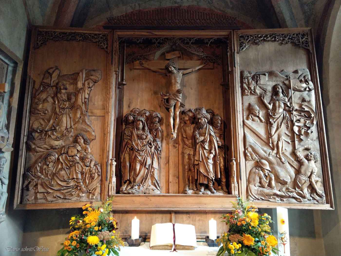 Das Fehlen einer Farbschicht ermöglichte es mir, die herausragende Kunstfertigkeit besser wahrzunehmen. Den Effekt der schlichten Gestaltung finde ich für das dargestellte religiöse Motiv sehr passend, obwohl bisher nicht abschließend geklärt werden konnte, ob das Retabel so schlicht bleiben sollte. Die Stimmung in der Kirche St. Peter und Paul war an jenem Herbstabend sehr angenehm ruhig. Ich war allein mit dem Kunstwerk und konnte es mir ohne Ablenkung ansehen.