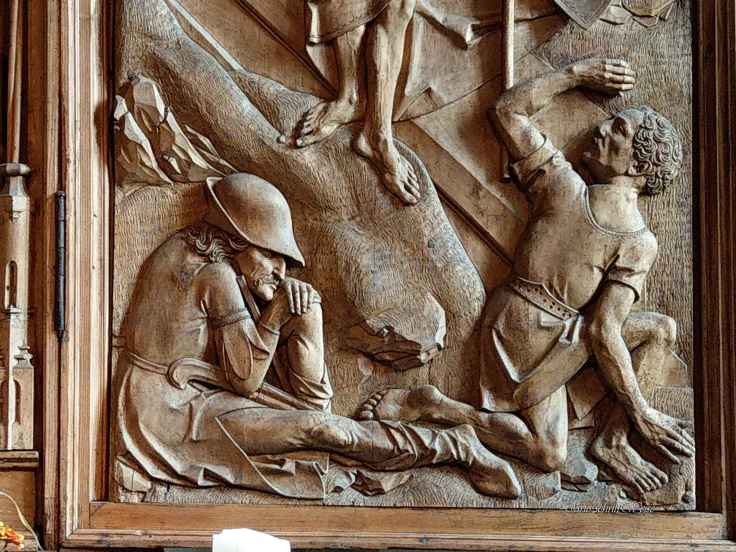 Für die Figur, die sich im mittleren Relief zwischen dem Kreuz und dem Priester Kaiphas befindet, habe ich eine These. Darin könnte sich der Künstler verewigt haben. Zu jener Zeit haben sich die Künstler häufig in Portraits von Figuren auf dem Kunstwerk verewigt, was für das Kreuzigungs-Retabel nicht bezeugt ist, aber dafür in einem anderen Werk von Riemenschneider vermutet, im Creglinger Marien-Retabel. Darin glaubte ich eine Ähnlichkeit zu diesem Portrait erkennen zu können. Die Figur stellt vermutlich einen Söldner dar, ob ihm der Künstler seine eigenen Gesichtszüge verliehen hatte, wird eine Spekulation bleiben.