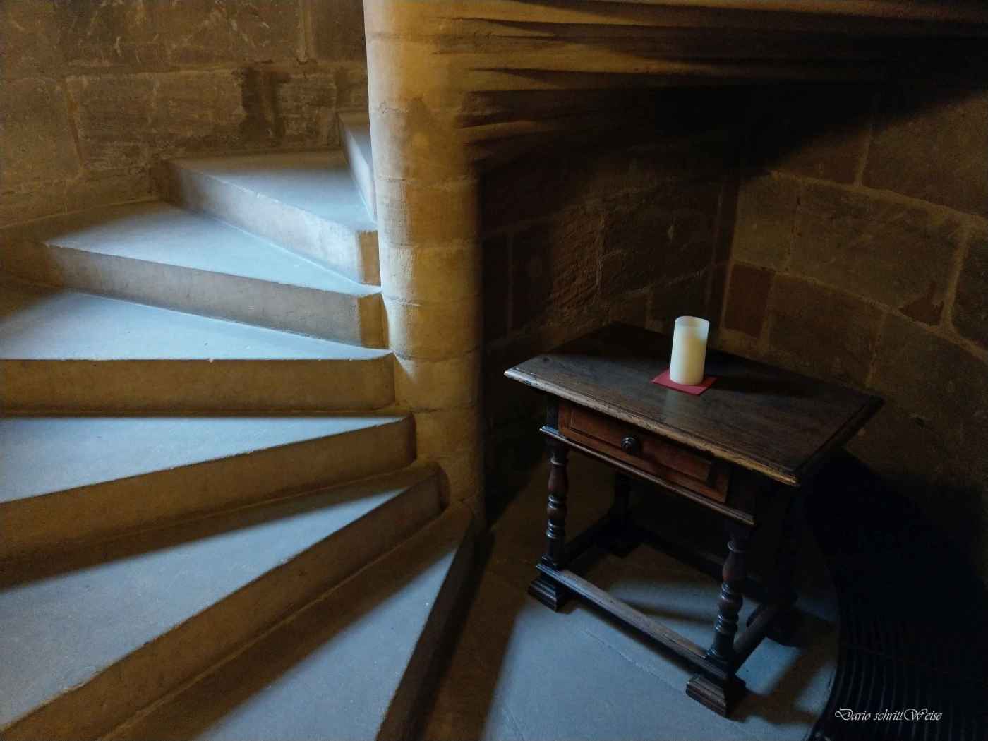 Das Foto erzählt eine eigene Geschichte. Eine Treppe, die zu den oberen Etagen des Schlosses führt, eine Kerze, die für Licht sorgt. Als Betrachter fühle ich mich regelrecht eingeladen, in die Szene einzutauchen. Ich habe das Gefühl, gleich die Treppe hinaufsteigen zu können. In wenigen Augenblicken könnte ich erfahren, was mich auf dem nächsten Stockwerk erwartet. Die Kerze würde ich zur Sicherheit mitnehmen, für den Fall, dass es oben dunkel ist.