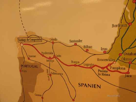 Ich fotografierte bei einer Gelegenheit die Karte des Camino Francés. Die Strecke ist mit der roten Farbe markiert, ich folge dem Hauptweg. Auf der Karte ist sogar noch Bordeaux zu sehen, von wo aus ich mit dem Bus angereist bin. Die Strecke von den Pyrenäen über Roncesvalles, Pamplona, Puente la Reina und Logroño bis Burgos lief ich 2019, den Rest werde ich ab heute laufen.