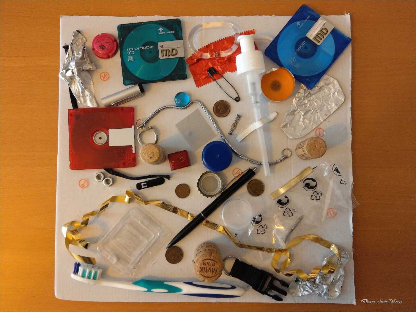 Die meisten der Gegenstände stehen für etwas, was zwar tagtäglich benötigt wird, aber nicht unbedingt von Dauer ist. Sogar für die Unterlage habe ich eine alte Kartonkiste verwendet. In die Auswahl haben es diejenigen Fundstücke geschafft, die ohnehin den Weg in den Abfall gefunden hätten. Es ist somit in meinen Augen ein Upcycling, ein Aufwerten von Gegenständen.