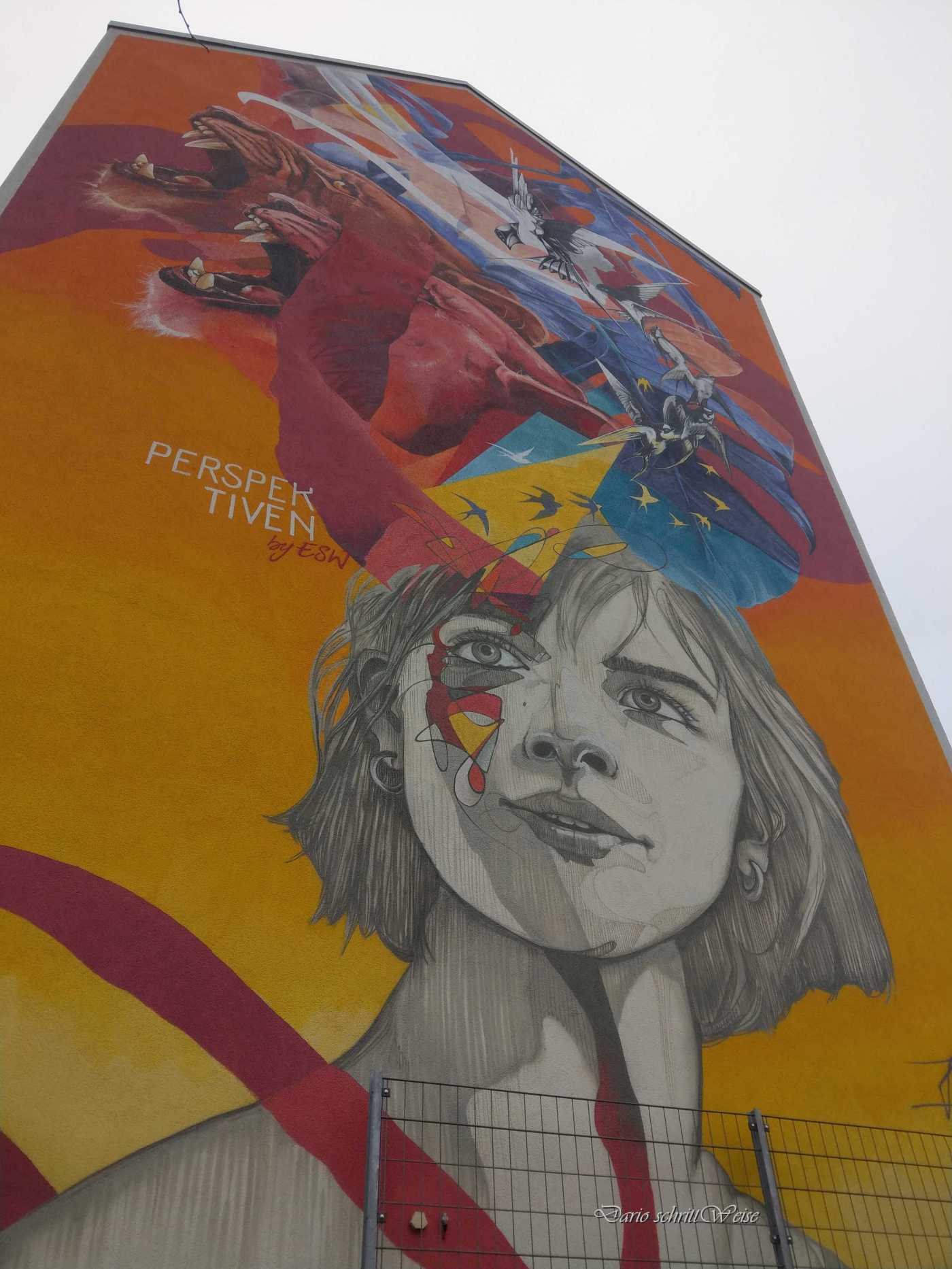 Auf der großflächigen Wandmalerei in der Köhnstraße ist eine Frau dargestellt, aus deren Kopf Traumbilder zu entspringen scheinen. Es sind wohl die „Perspektiven“, auf die der Bildtitel hinweist.